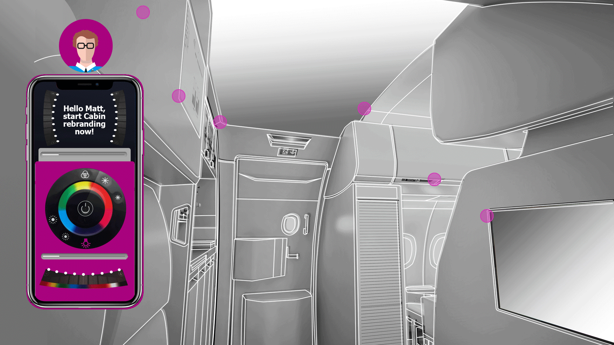 Imagine, the Inside of a plane is now a blank canvas ready to be painted, all kinds of branding and rebranding options are possible now. Choose any color and decor - for lights, decorations, logos, lining, design, special moods for special moments, any digital advertising! Customizable Airline Branding and instantly changeable content is the “NEW WAY”