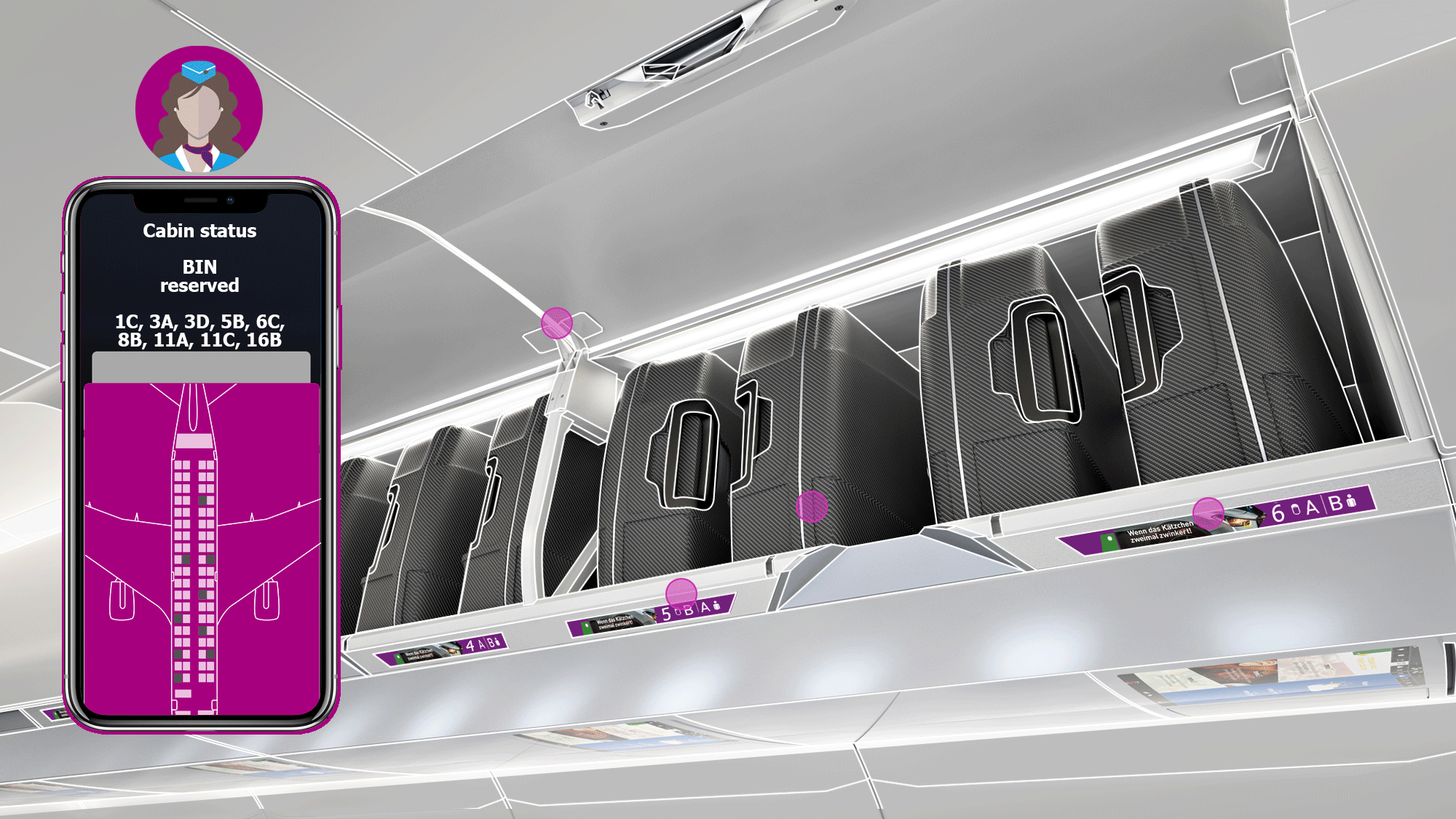 A first concept was displayed @ AIX 2019 in the “Diehl Kabine” as part of the “Smart Surfaces”, integrated in a stowage wall